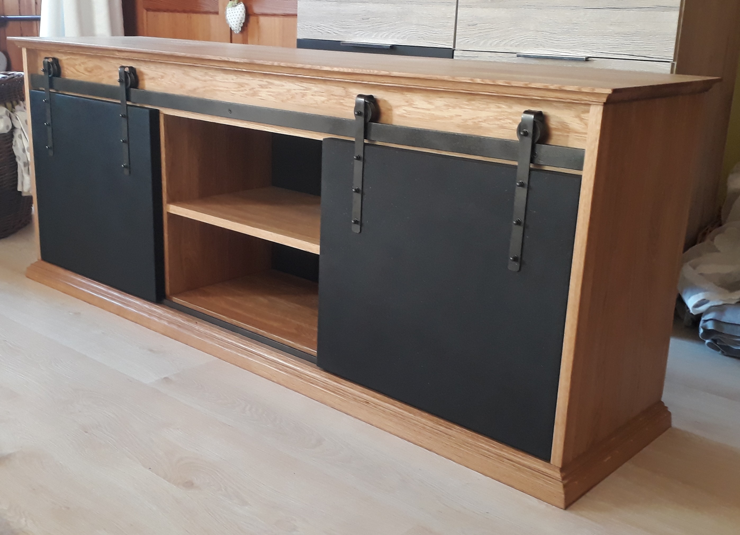 Meuble TV en chêne massif avec portes coulissantes noires. Les roulements ont été imaginés et réalisés par mes soins afin de répondre aux souhaits des clients.