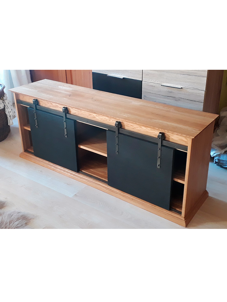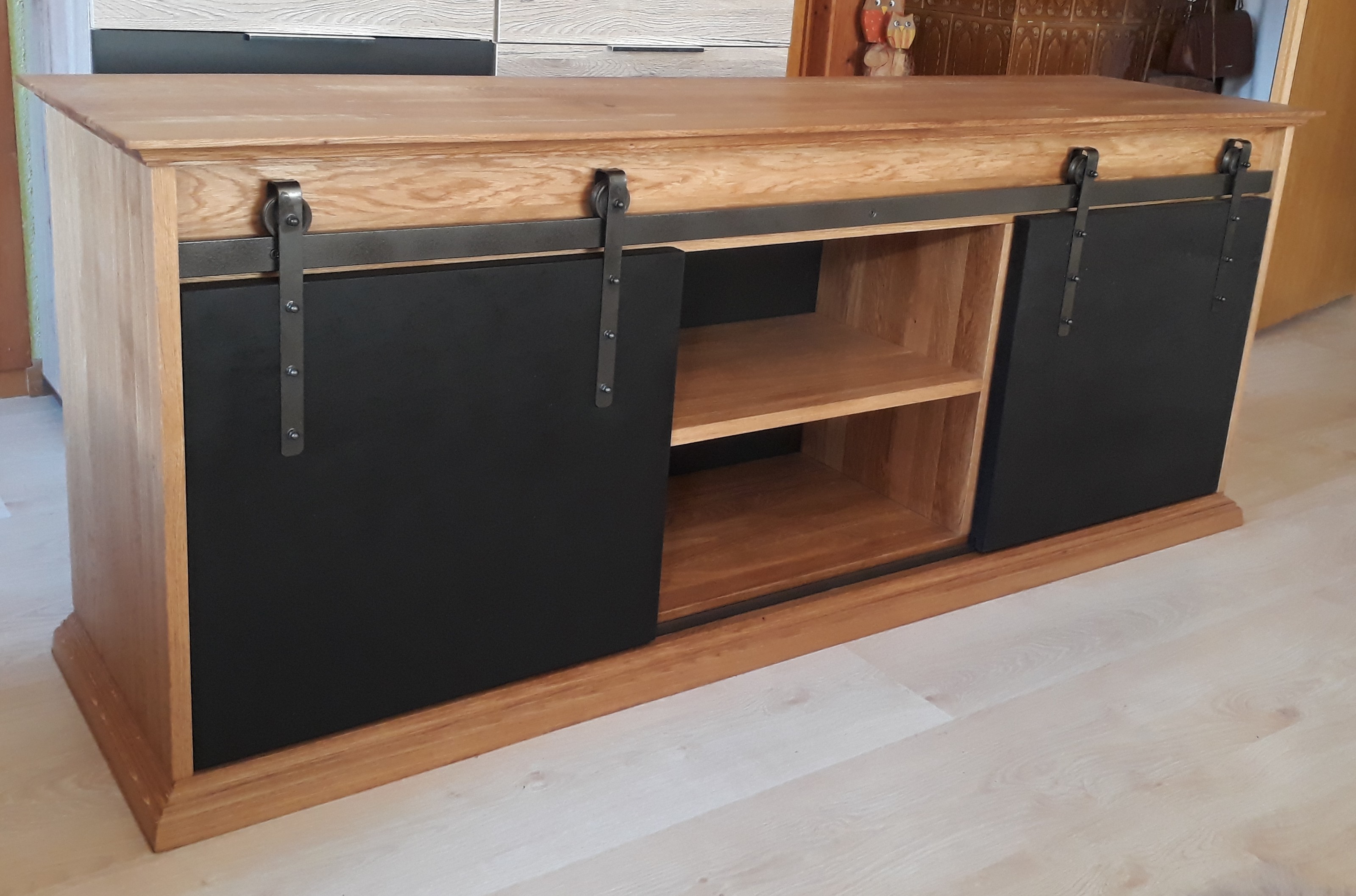 Meuble TV en chêne massif avec portes coulissantes noires. Les roulements ont été imaginés et réalisés par mes soins afin de répondre aux souhaits des clients.