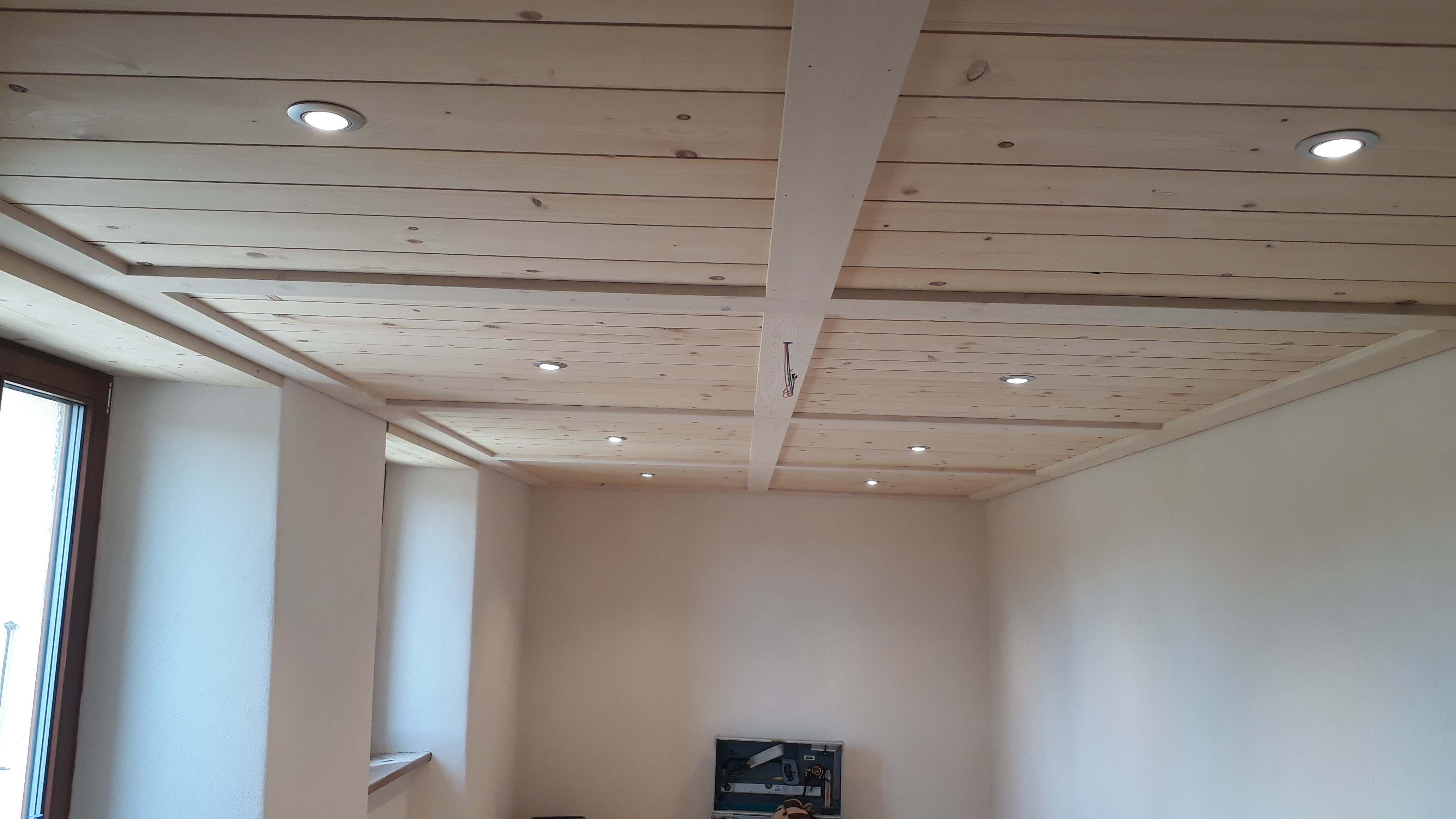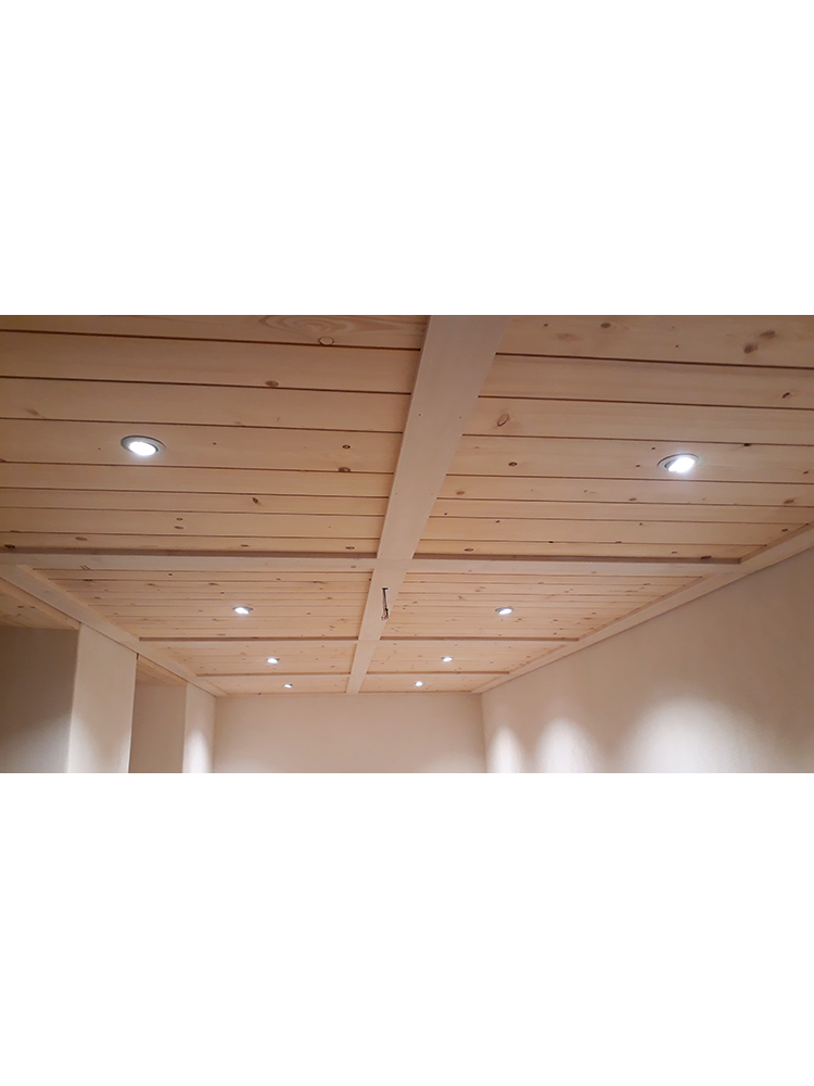 Plafond en lames de sapin dont la conception intègre une structure quadrillée, offrant un rendu chaleureux et harmonieux. Chaque section du quadrillage est équipée d’un spot soigneusement encastré, pour un éclairage moderne et discret