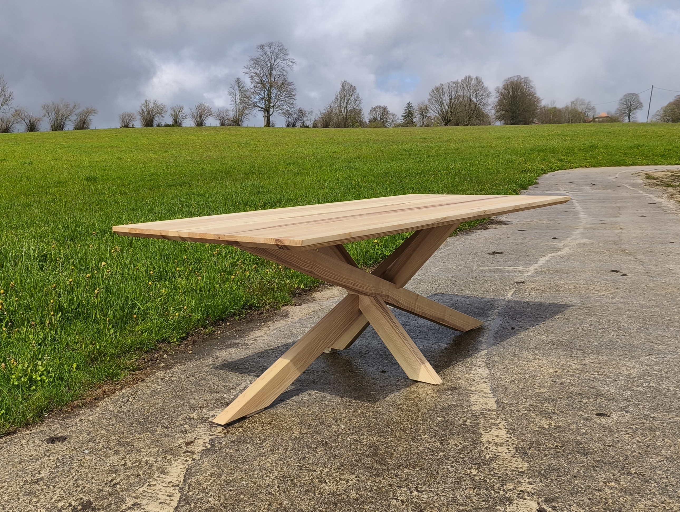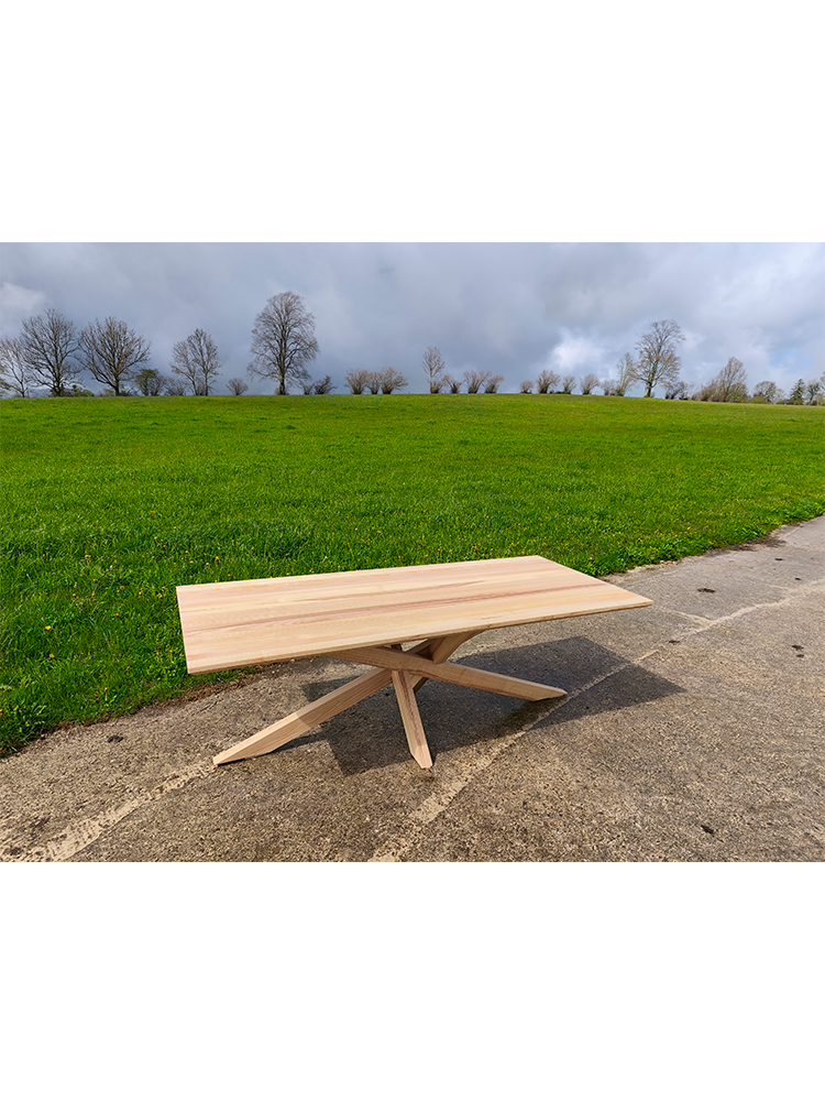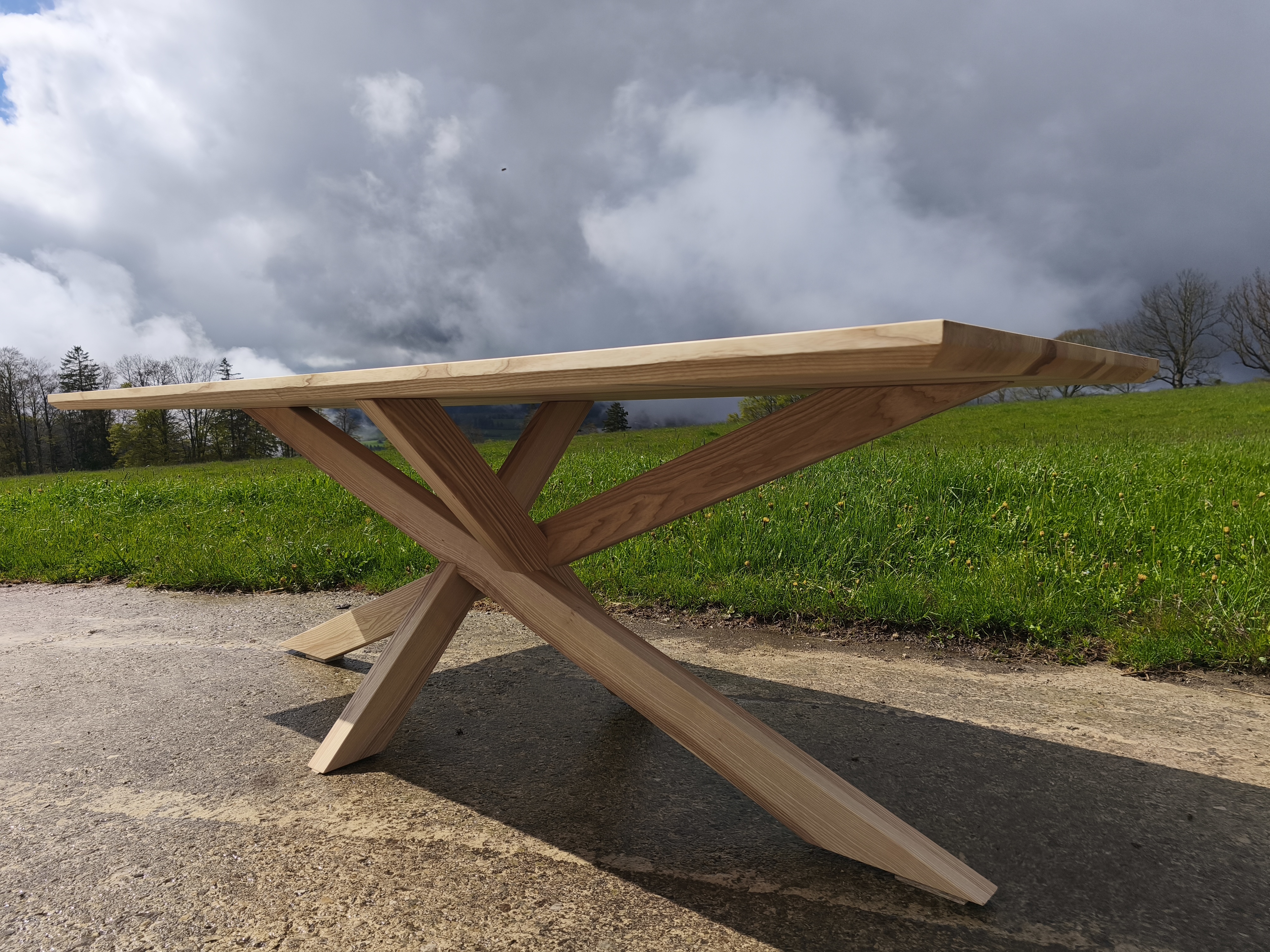 Conception d’une table à manger en frêne massif, dont le pied assemblé en mikado révèle des lignes modernes et originales.