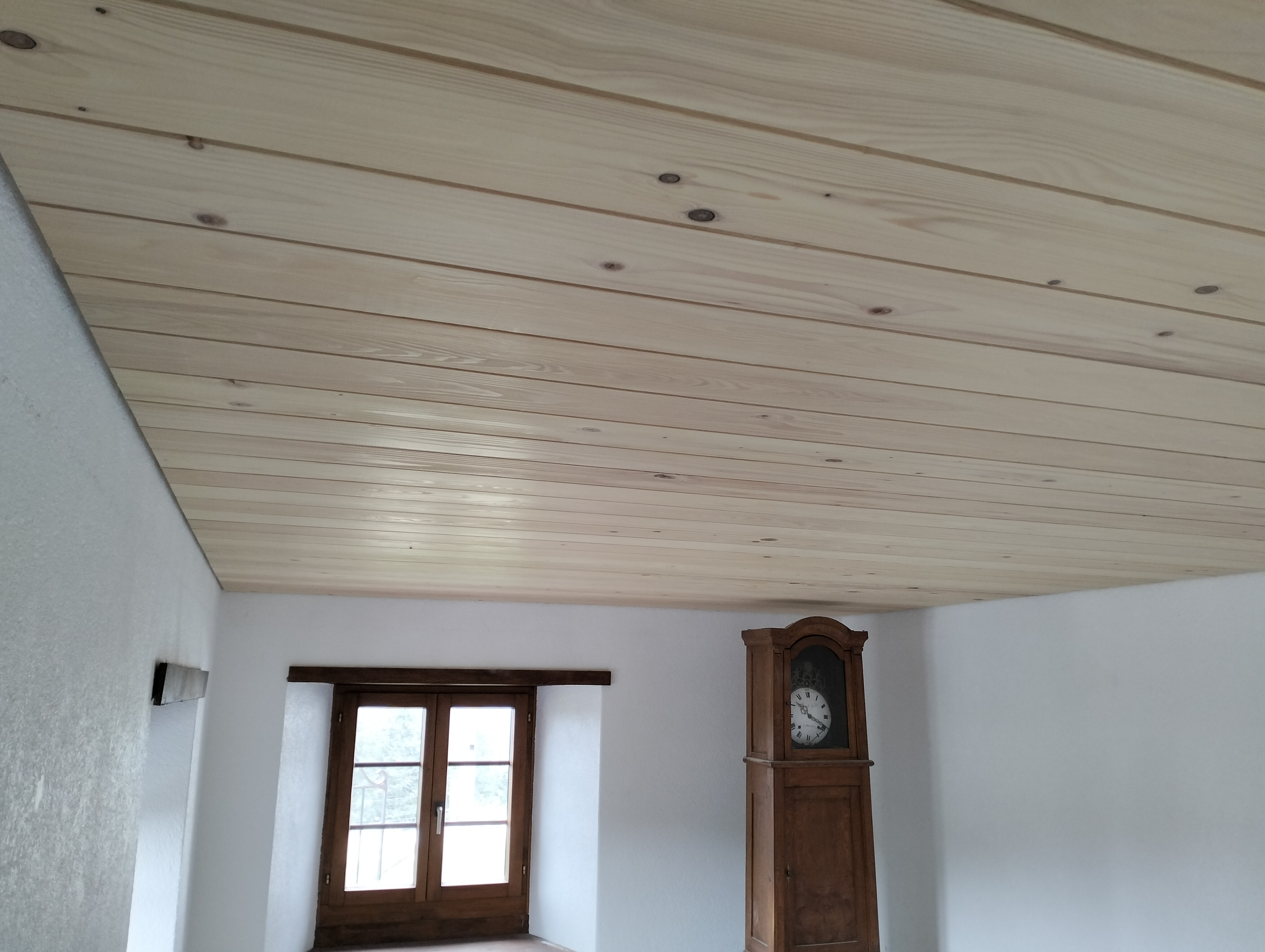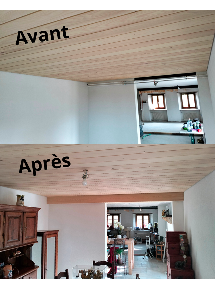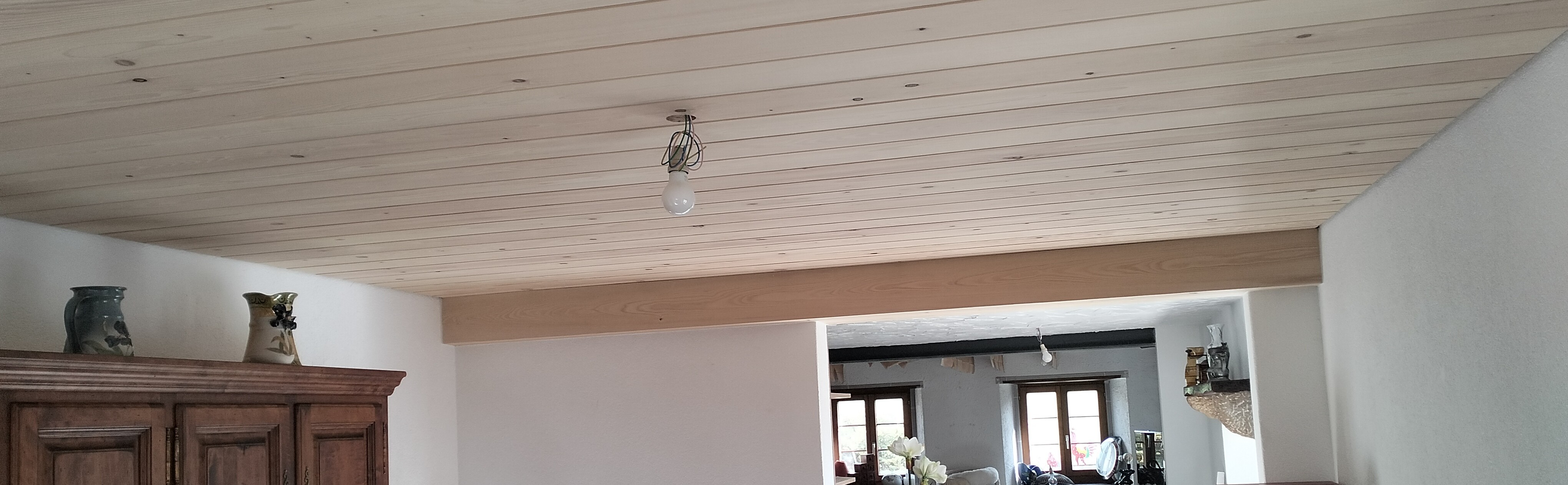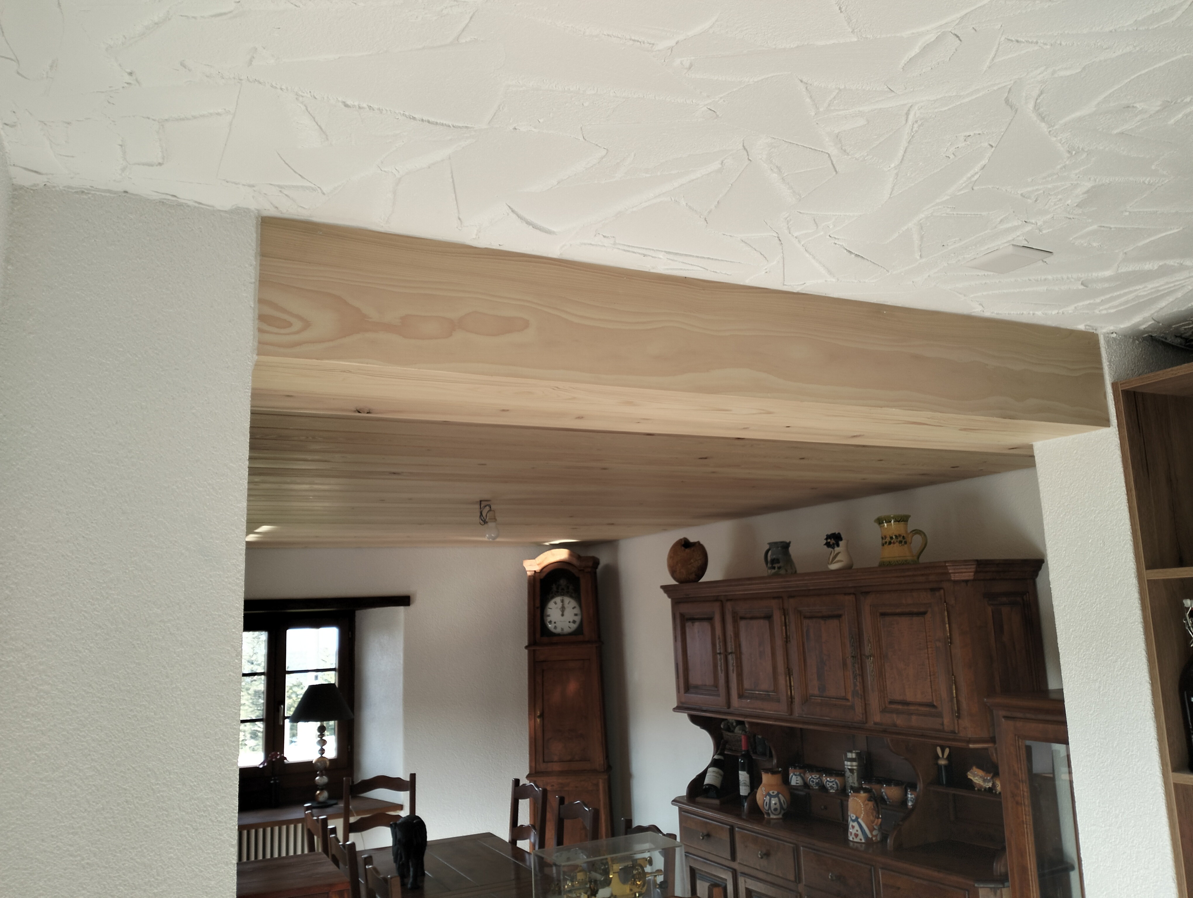 Conception et pose d’un plafond en lames de sapin brossées offrant un rendu authentique, accompagnées de la fabrication d’une fausse poutre destinée à dissimuler les tuyaux.