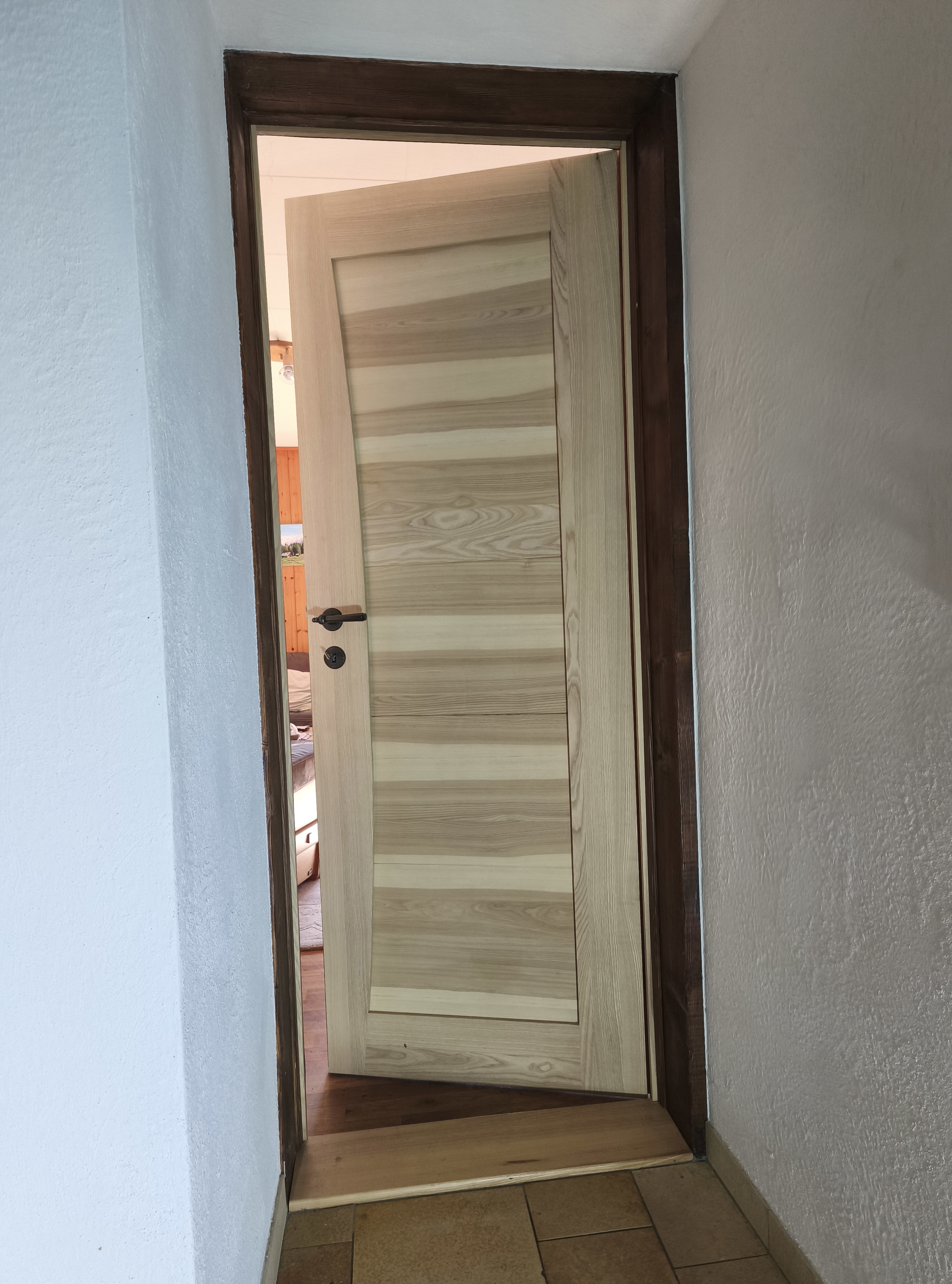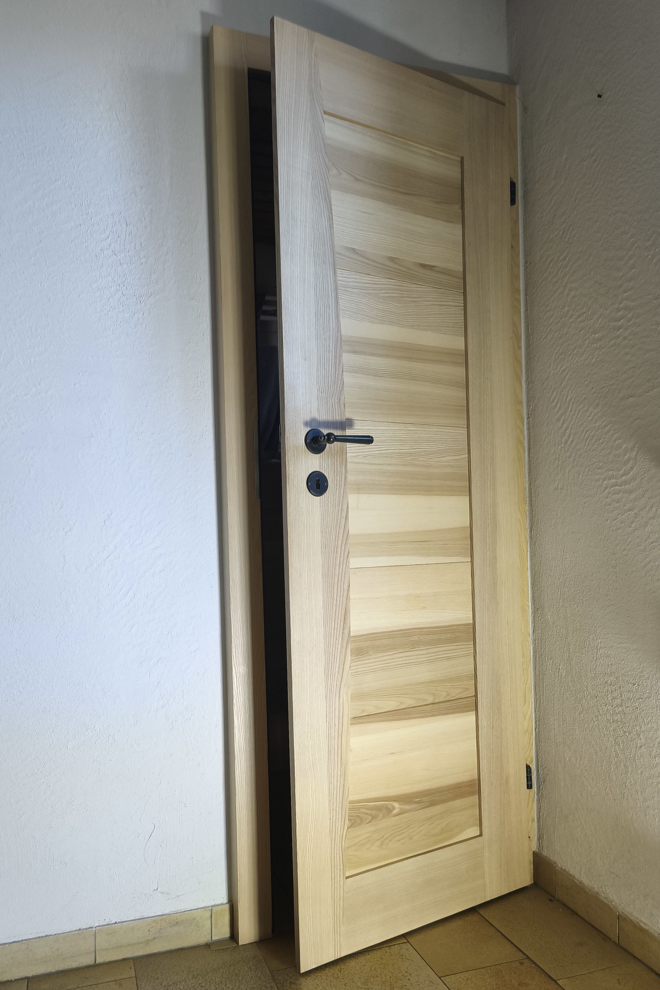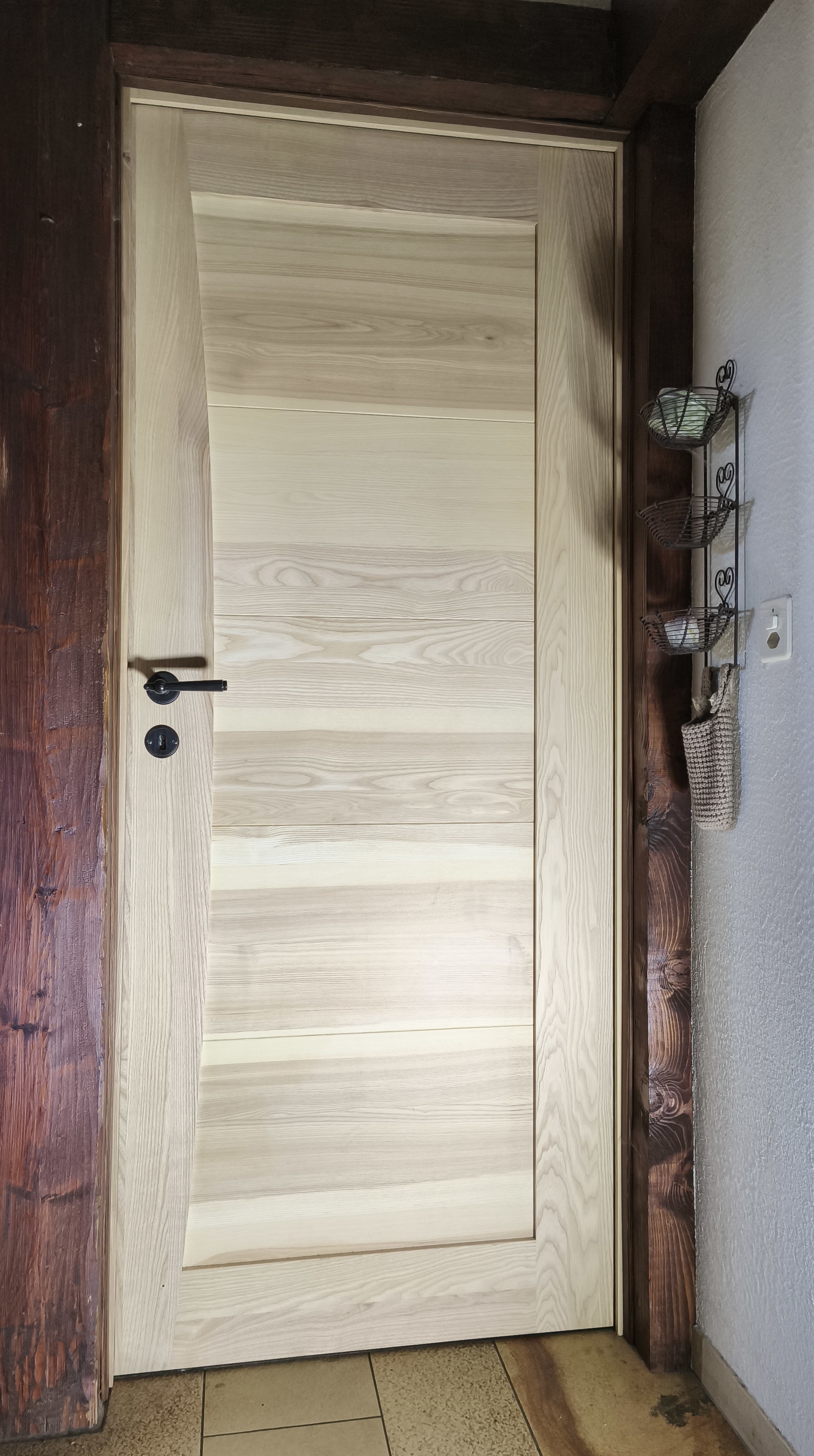 Porte de communication en frêne massif, dont un montant présente un arrondi élégant. Ses lignes originales et uniques apportent une touche personnelle à ces portes conçues spécialement sur mesure.